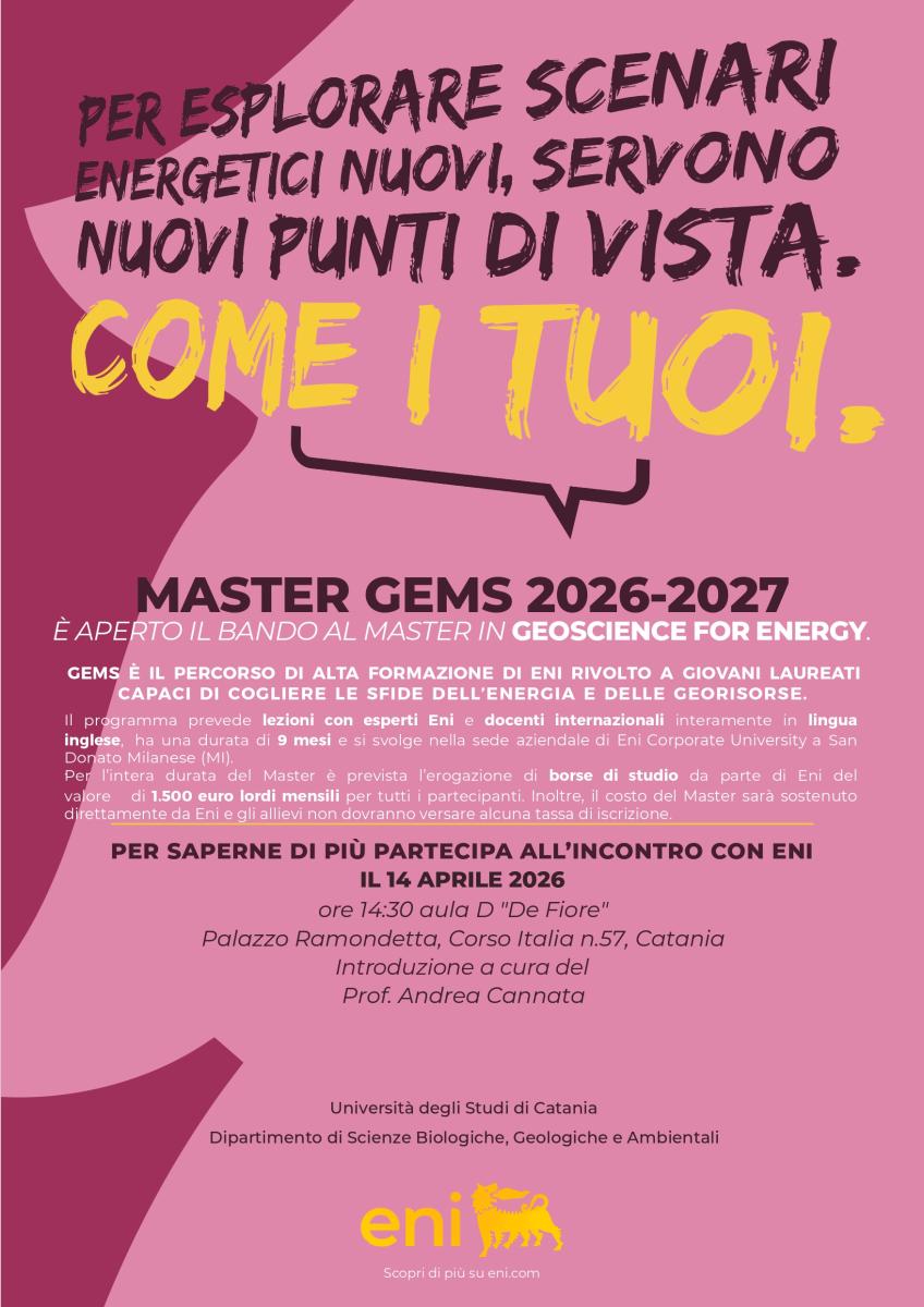 Si informano gli studenti che martedì 14 aprile 2026 alle ore 14:30, presso Aula D “De Fiore” (Università degli Studi di Catania), si terrà un incontro di presentazione del Master GEMS – Geoscience for Energy, promosso da ENI.