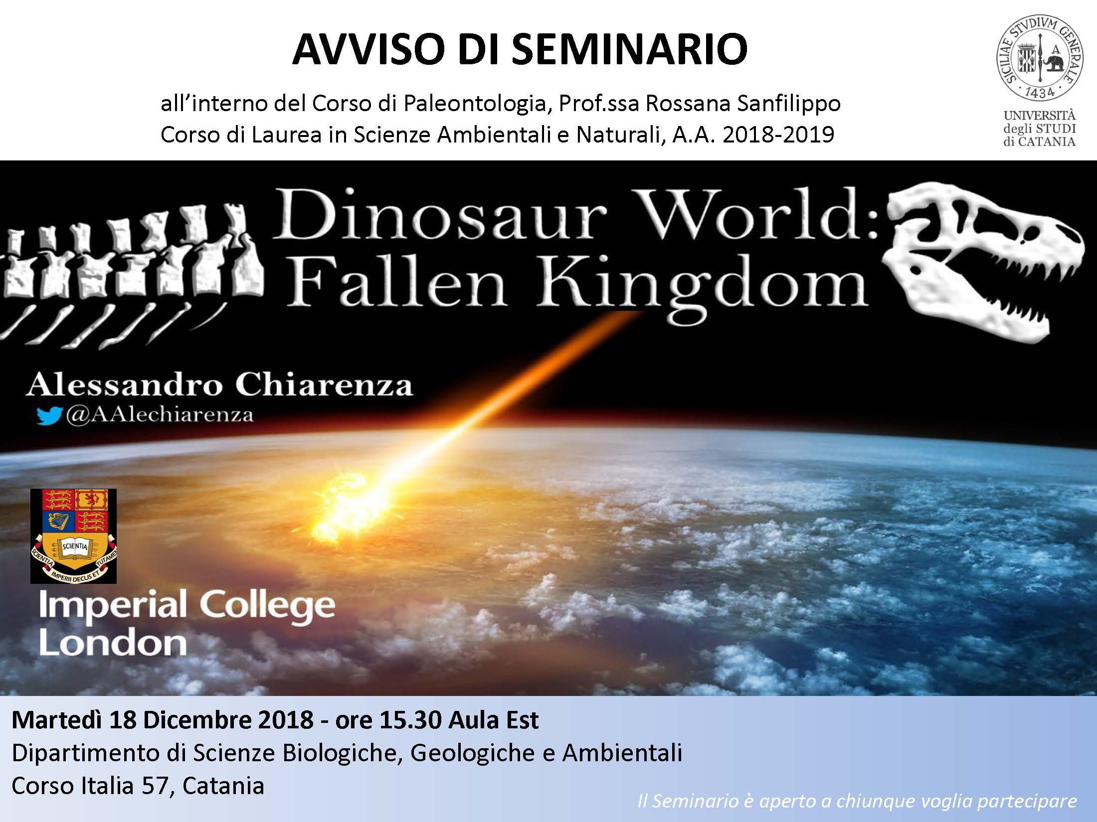 Martedì 18 dicembre alle ore 15.30 aula Est, Sezione Scienze della Terra, Dipartimento Scienze Biologiche, Geologiche e Ambientali, corso Italia 57 si terrà il seguente seminario: ”Dinosaur World: Fallen Kingdom” tenuto dal Dott. Alessandro Chiarenza (PhD Imperial College, London).