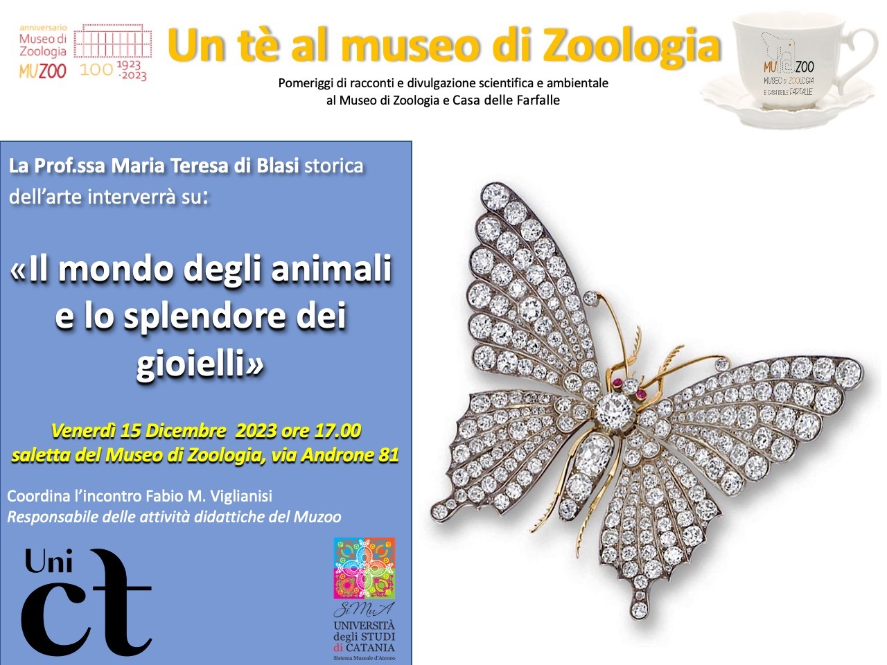 la Prof.ssa Maria Teresa Di Blasi, il 15 dicembre alle 17.00, presso la saletta del museo di Zoologia di Catania, ci parlerà dell'originale connubio tra gioielli e il mondo degli animali che può dare vita a creazioni affascinanti e significative. Gli animali infatti hanno spesso ispirato designer e artisti a creare gioielli che rappresentano la bellezza, la forza e la simbologia associata a diverse specie animali.